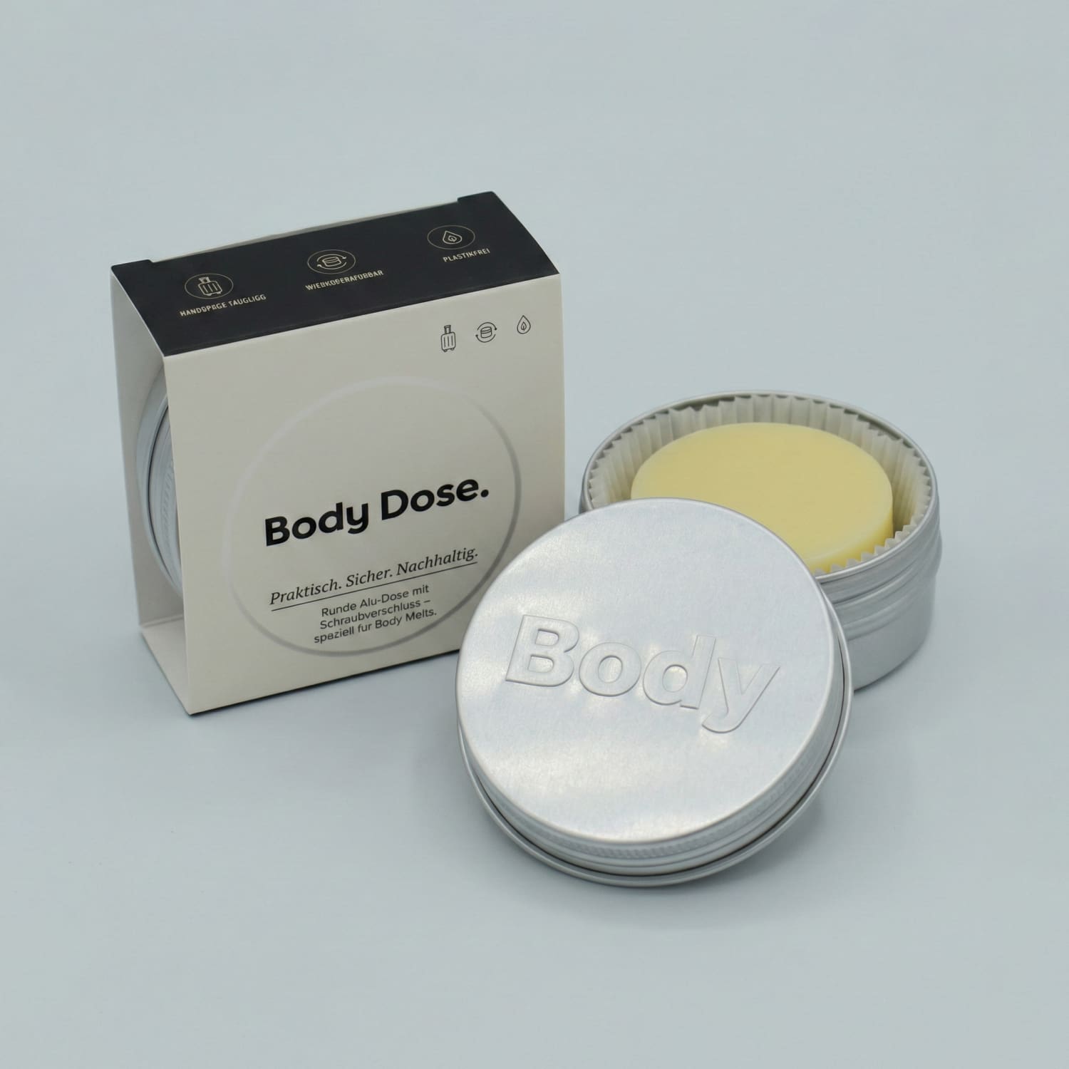 Unsere Body Melt Alu-Dose ist der ideale Begleiter für deine Body Melts. Sicher verschraubbar, leicht und robust – perfekt für unterwegs, auf Reisen oder im Badezimmer. Kein Auslaufen, kein Ankleben, kein Produktverlust.