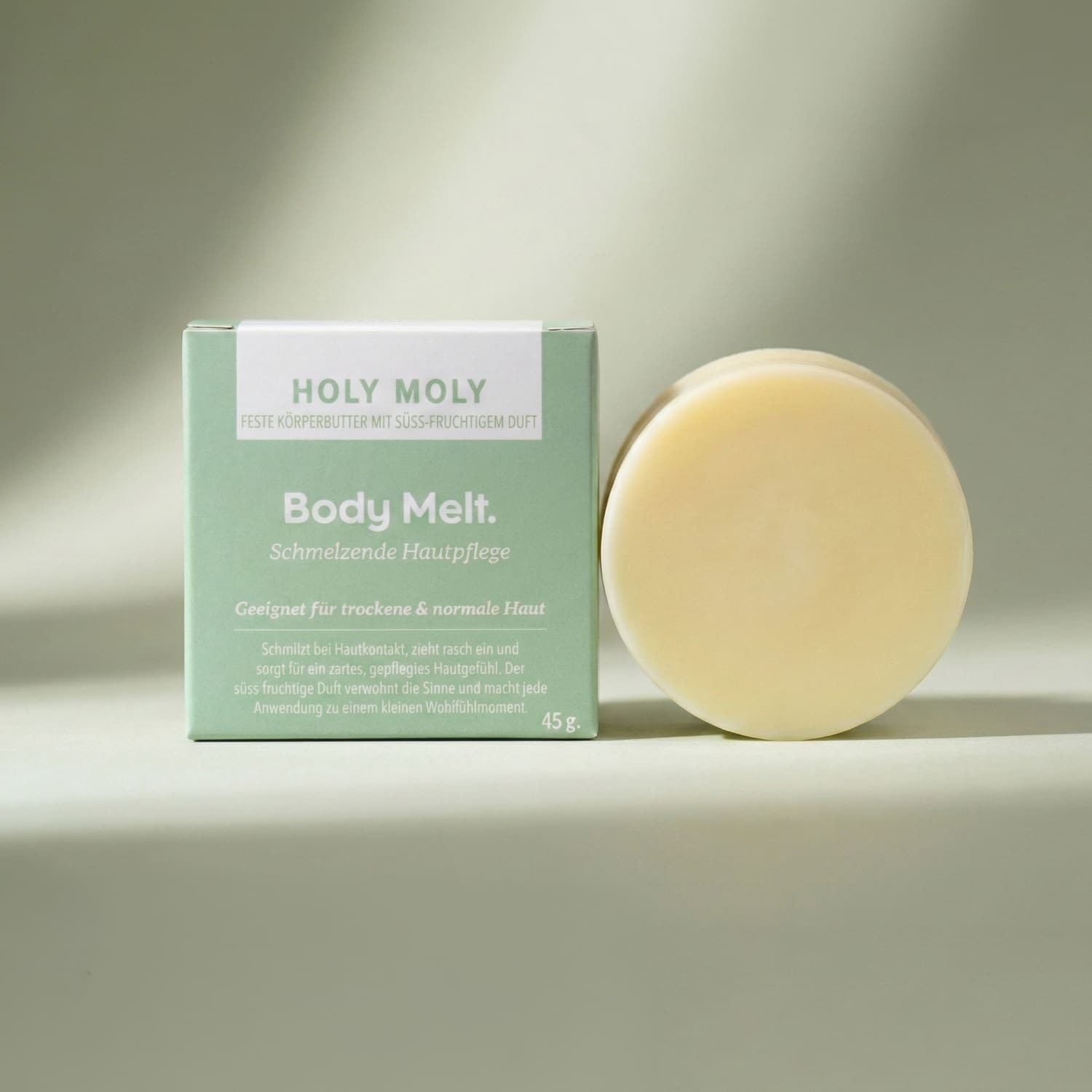 Der Holy Moly Body Melt ist eine feste Körperbutter mit fruchtig-süssem Duft und cremigem Schmelz. Das handliche 45-g-Stück liegt perfekt in der Hand, schmilzt bei Hautkontakt, zieht rasch ein und hinterlässt ein zart gepflegtes, geschmeidiges Hautgefühl. Ein kleiner Wohlfühlmoment für jeden Tag.